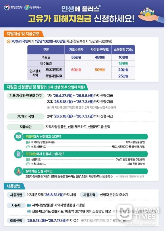 한편, 오는 5월 18일부터 7월 3일까지는 1차 지급대상을 제외한 소득 하위 70% 시민을 대상으로 2차 지원금의 신청·지급이 이어진다. 건강보험료를 활용한 세부 선정 기준(컷오프) 등 구체적인 사항은 5월 중 행정안전부의 별도 지침이 마련되는 대로 확정·안내할 예정이다.