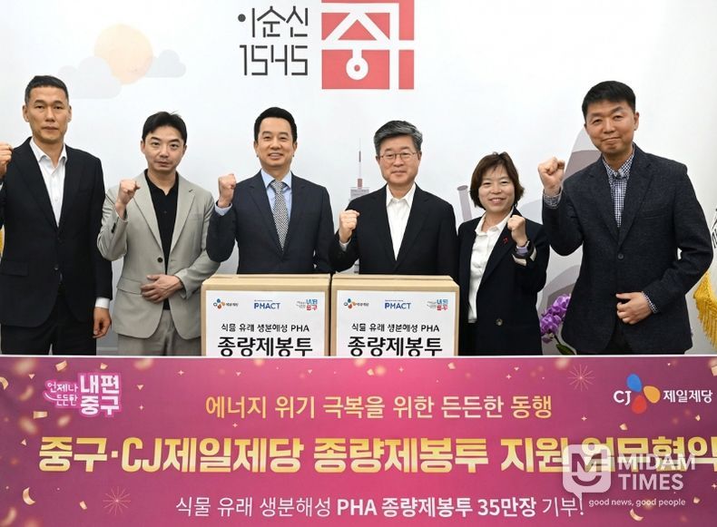 미담타임스 정주환 기자 | 서울 중구는 지난 24일 CJ제일제당과 ‘종량제봉투 무상 공급·지원 업무협약’을 체결하고, 생분해성 PHA 종량제봉투 35만 장을 기탁받기로 했다고 28일 밝혔다.