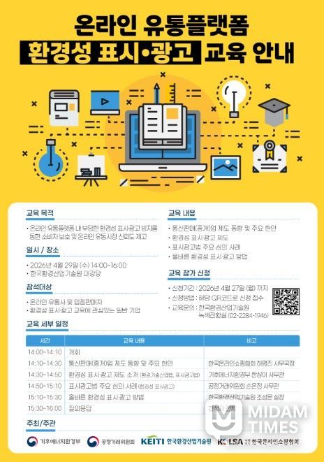 미담타임스 김준완 기자 | 공정거래위원회와 기후에너지환경부는 4월 29일 한국환경산업기술원 대강당(서울 은평구 소재)에서 온라인 유통사를 대상으로 ‘환경성 표시·광고 교육’을 개최한다고 밝혔다.