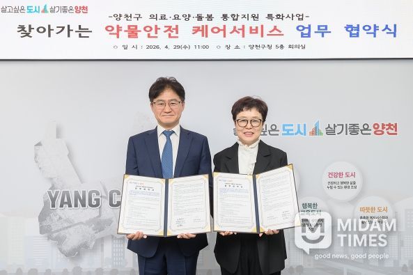 미담타임스 정주환 기자 | 양천구는 29일 오전 구청 5층 회의실에서 양천구약사회와 ‘찾아가는 약물안전 케어서비스’ 추진을 위한 업무협약(MOU)을 체결했다고 밝혔다. 이번 협약은 약물관리가 필요한 취약계층을 대상으로 약사가 직접 가정을 방문해 맞춤형 서비스를 제공하는 양천구 통합돌봄 특화사업의 일환이다.
