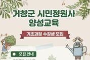 미담타임스 김교환 기자 | 거창군은 정원 전문 지식을 갖춘 시민정원사를 양성하고, 체계적인 정원관리 봉사활동을 활성화해 지역 정원문화 확산과 관련 산업 육성에 도모하기 위해 ‘시민정원사 양성교육 기초과정’ 수강생을 모집한다. 이번 기초과정은 정원에 관심 있는 거창군민이며 누구나 신청 가능하며, 모집인원은 20명 내외이다. 접수는 오는 25일부터 27일까지며, 거창창포원 운영 담당 방문 또는 우편으로 신청할 수 있다. 이번 교육은 3월 20일부터 7월 10일까지 매주 금요일 12시부터 18시까지 거창창포원 다목적실에서 진행될 예정이다. 교육과정은 이론 39시간, 실습 49시간으로 구성되며, 정원식물 이해, 정원식물 관리, 정원조성 방법 등 실무 중심 강의와 현장실습도 포함된다. 교육을 수료한 시민정원사는 향후 거창군 내 다양한 정원봉사 활동과 심화교육 참여 기회도 제공받게 된다. 신동일 환경과장은 “시민정원사 양성교육을 통해 주민들의 정원 전문성을 높이고 지역 정원문화 확산에 기여하길 기대한다”며 “정원에 관심 있는 군민들의 많은 참여를 바란다”고 말했다.
