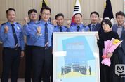 미담타임스 김준완 기자 | 울진해양경찰서는 지난 달 31일 김승현 작가의 회화 작품 '바다빛 결' 기증식 및 감사패 수여식을 개최했다고 밝혔다. 이번 기증식은 울진해양경찰서 개서 당시 현판식 장면을 주제로 한 회화 작품을 통해, 울진해경의 출범과 국민 안전을 향한 초심을 되새기고자 마련됐다. 기증식에는 배병학 서장을 비롯해 각 과장 및 직원, 김승현 작가 등이 참석했으며, 작품 기증의 의미와 제작 배경을 공유하는 사전 환담회를 시작으로 작품 전달식과 감사패 수여 순으로 진행됐다. 김승현 작가의 작품 '바다빛 결'(Acrylic on canvas, 90×72, 2025)은 바다의 흐름과 빛을 통해 ‘해양경찰의 사명과 헌신’을 시각적으로 형상화한 작품으로, “바다는 쉼 없이 흐르며 세상의 숨결을 품는다”는 작가의 메시지처럼, 울진해경이 바다의 생명과 국민의 안전을 끝까지 지켜가겠다는 의지를 상징적으로 표현하고 있다. 작가는 “이 작품이 울진해경 직원들에게 자긍심과 영감을 주는 상징으로 오래 남기를 바란다”고 소감을 전했다. 배병학 울진해양경찰서장은 “울진해경의 첫걸음을 예술로 기록해주신 김