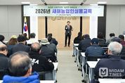 미담타임스 김준완 기자 | 경북 고령군은 1월 13일 오전 10시부터 오후 2시까지 관내 농업인을 대상으로 2026년 새해 농업인 실용교육을 실시했다. 이번 교육은 대가야읍, 운수면, 덕곡면 지역 농업인 131명이 참석한 가운데 성황리에 진행됐으며, 새해 영농계획 수립과 안정적인 마늘 재배를 지원하기 위해 마련됐다. 이날 강의는 합천군농업기술센터 강황수 마늘전문지도사가 맡아 고령군의 주요 소득 작목인 마늘 재배 기술을 중심으로 진행됐다. 강 지도사는 현장 경험을 바탕으로 △마늘 생육 단계별 관리 요령 △기상 변화에 따른 재배 대응법 △병해충 예방 및 방제 기술 △수확 후 품질관리 방법 등을 체계적으로 설명해 참석자들의 큰 호응을 얻었다. 특히 최근 기후 변화와 재배 환경 변화에 대응한 실질적인 영농 노하우와 현장 적용 사례를 중심으로 한 강의가 이어져 농업인들의 이해도를 높였다는 평가다. 이후 1월 15일 목요일 금천온누리마당 강황수 강사, 1월 20일 화요일 다산농협산지유통센터 이희모 강사, 1월 22일 목요일 쌍림농협 이희모강사의 마늘교육 및 정지혜 연구사 자체 강사의 벼농사 교육이 10시부터