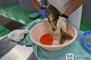 미담타임스 김준완 기자 | 경상북도 민물고기연구센터는 11월 1일 산란을 위해 울진 왕피천으로 돌아오는 어미연어 첫 포획이 시작되어 본격적인 종자생산 작업에 들어갔다. 이번에 포획된 어미연어는 13마리(암컷 6, 수컷 7), 전장 70㎝급으로, 이곳에서 3~4년 전 방류된 어린 연어가 북태평양을 회유하며 성장한 뒤 왕피천으로 돌아온 개체다. 연구센터는 왕피천 하류에 길이 250m 포획장을 설치해 어미연어를 포획, 채란, 종자를 생산해 내년 봄 60만 마리의 치어를 왕피천에 방류한다. 올해는 10월 지속적인 강수로 인해 포획장 설치 지연으로 첫 포획이 다소 늦어졌으나, 지금부터 주 산란 시기로 목표량 달성에 최선을 다할 예정이다. 아울러 수산 계열 고등학생을 대상으로 채란, 수정, 부화 등 인공부화 전 과정을 체험할 수 있는 현장학습 프로그램도 운영한다. 연어 방류 사업은 하천 개발 등으로 산란장이 훼손되어 연어의 자연 산란이 어려워짐에 따라 경북도에서 1970년부터 이어온 사업으로, 인공부화를 통한 치어방류로 도내에 연어가 회귀하는 하천을 계속 보존하기 위한 중요한 사업이다.