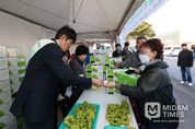 미담타임스 김준완 기자 | 무주군이 10월 30일부터 11월 1일까지 3일간 무주농협 하나로마트 본점에서 ‘무주 반딧불 샤인머스캣’ 판촉 행사를 연다. 시식 행사를 겸한 이번 행사에는 총 2천 박스 4톤 물량이 공급될 예정이다, 2kg 1박스가 7천 원으로 시중보다 30% 정도 저렴하게 판매돼 소비자들로부터 큰 호응을 얻고 있다. 행사 첫날인 30일에는 황인홍 무주군수와 오광석 무주군의회 의장, 곽동열 무주농협장, 양시춘 무주군농협조합공동사업법인 대표, 김범석 농협중앙회 무주군지부장 등 20여 명이 함께 무주 반딧불 샤인머스캣의 우수성을 알리며 소비 촉진에 나서 의미를 더했다. 무주반딧불조합공동사업법인 관계자는 “무주 반딧불 샤인머스켓은 높은 당도와 우수한 식감, 월등한 품질로 국내외에서 모두 큰 인기를 얻고 있다”라며 “이번 판촉 행사가 지역주민들에게는 무주산 샤인머스캣의 우수성을 알리는 계기가 되고. 판로 확보에 어려움을 겪는 농가들에게는 소득증대의 기회가 되길 바란다”라고 전했다. 현재 무주군 내 샤인머스캣 재배 규모는 58농가 28ha로, 무주군은 올해 가격안정기금사업을 통해 3