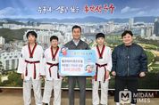 미담타임스 김준완 기자 | 힘찬태비태권도장이 11월 7일 오후 4시 30분 중구청 구청장실을 찾아 울산사회복지공동모금회를 통해 이웃돕기 후원금 30만 원을 전달했다. 이번 전달식에는 김영길 중구청장과 김아롱 힘찬태비태권도장 관장, 태권도장 아동 등 5명이 참석했다. 힘찬태비태권도장은 ‘2025년 종갓집 중구 체육대회’ 입장식(퍼레이드) 행사에 참여해 학성동 주민자치위원회로부터 받은 사례비를 전액 기부했다. 해당 후원금은 지역 내 홀몸 어르신 3명에게 각 10만 원씩 전달될 예정이다. 김아롱 힘찬태비태권도장 관장은 “아이들과 함께 지역 행사에 참여하고 나눔도 실천할 수 있어서 뜻깊다”며 “앞으로도 주변에 희망과 사랑을 전하기 위해 노력하겠다”고 말했다. 김영길 중구청장은 “어려운 이웃을 위해 따뜻한 마음을 모아주셔서 감사드린다”며 “겨울을 앞두고 홀몸 어르신의 생활을 살피고 지원하는 데 후원금을 잘 활용하겠다”고 밝혔다.