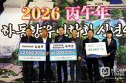 미담타임스 김교환 기자 | 하동군은 지난 9일 개최된 ‘전국하동향우연합회 2026년 신년인사회’에서 김영목 마산향우회장과 김옥찬 대한경제신문 부산·경남 지사장이 각각 고향사랑기부금 200만 원, 100만 원을 전달했다고 밝혔다. 이날 행사에는 황갑선 전국하동향우연합회장을 비롯한 각 지역 향우회 임원과 지역 인사들이 참석해 새해 인사를 나누고, 고향 하동의 지속 가능한 발전 방향을 논의했다. 김영목 회장과 김옥찬 지사장의 고향사랑기부는 이러한 뜻깊은 날에 의미를 더하며 함께 새해를 맞이하는 향우들의 끈끈한 연대와 우정을 보여줬다. 하승철 하동군수는 감사의 인사를 전하며 “고향사랑기부는 내 고향에 대한 마음을 전할 수 있는 소중한 수단이 되어주고 있다. 소중한 기부금을 군민들이 가장 필요한 곳에 사용하겠다”라고 말했다. 한편, 고향사랑기부제는 개인이 현재 주소지를 제외한 지방자치단체에 연간 최대 2천만 원까지 기부할 수 있는 제도이다. 10만 원 이하는 전액 세액 공제, 10만 원 초과 20만 원 이하는 44%, 20만 원 초과분에 대해서는 16.5%의 세액 공제 혜택이 주어지며, 누구든