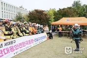 미담타임스 정주환 기자 | 서대문구는 최근 이화여자대학교 산학협력관 일대에서 진행한 ‘2025 재난대응 안전한국훈련’을 성공리에 마무리했다고 3일 밝혔다. 이번 훈련은 ▲지진에 따른 건축물 붕괴와 화재 ▲전기·가스시설 파손 ▲도로 싱크홀 및 인근 산불 확산 등 복합 재난 상황을 가정해 이루어졌다. 단일 재난이 다른 재난으로 연쇄 확산하는 ‘복합 재난’의 특성을 반영해 현장 지휘·통제·복구 기능이 동시에 가동되는 통합형 훈련으로 추진했다. 서대문구청, 서대문소방서, 서대문경찰서, 이화여자대학교 등에서 300여 명이 참여한 가운데 각 기관은 재난 발생 시 상황판단 회의를 통한 신속한 의사결정과 유관기관 협조 체계를 점검했다. 이를 위해 통합지원본부 토론훈련과 실전형 현장훈련을 연계했다. 특히 이번 훈련에서는 소방 헬기와 로봇견(로봇개)을 활용한 입체적 화재 진압과 인명 수색 장면이 시연돼 실전 같은 긴장감을 더했다. 또한 서대문구청 ▲도로과의 ‘GPR(지반탐사 레이더) 차량을 통한 이화여대 일대 지반 공동 탐사’ ▲푸른도시과의 ‘안산(鞍山) 자락 잔불 진화’ ▲재난안전과의 ‘드론을 이용한