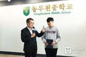 미담타임스 정주환 기자 | 김동연 경기도지사가 16일 동두천중학교를 찾아 노점 할머니께 비상금을 건넨 선행으로 화제가 된 옥현일 군에게 표창을 수여했다. 김 지사는 학교 현관에서 학생회와 함께 ‘함께라서 더 빛나는 우리’ 생명존중 캠페인에 동참하고, 이어 1층 로비에서 옥현일 군에게 표창장을 전달했다. 옥현일 군은 지난 7월 폭염 속에서 노점상 할머니에게 비상금 3만 원을 건네고 콩 한 봉지를 받은 사연이 알려지며 주목받았다. SNS에 게시된 영상은 인근 공방 운영자가 촬영한 것으로, 현일 군이 남모르게 베푼 선행이 담겨 3일 만에 206만 조회수, ‘좋아요’ 약 7만, 댓글 2,500개 이상을 기록했다. 당시 현일 군은 “더운 날씨에 할머니가 물건을 빨리 팔고 쉬셨으면 좋겠다는 마음이었다”고 말해 많은 시민에게 감동을 줬다. 김동연 지사는 이날 인사말을 통해 “옥현일 군이 도운 할머니가 우리의 어머니, 할머니”라며 “수많은 옥현일 군이 동두천중에 있다고 본다. 그것이 사람 사는 세상”이라고 말했다. 이어 “여러분이 그런 따뜻한 마음을 갖길 바란다. 당장은 남을 위한 배려 같지만 길게