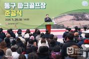 미담타임스 김준완 기자 | 울산 동구는 1월 26일 오후 2시 동구 동부동 99-15번지 일원에 지역 주민 150여 명이 참석한 가운데 동구파크골프장 준공식을 개최했다. 동구파크골프장은 안정적인 생활체육 공간 조성을 통하여 주민들의 체력 증진과 건강한 삶을 위하여 총면적 23,466㎡의 규모에 18홀과 부대시설을 조성했다. 시설 조성을 위해 총사업비 73억 5천만 원이 투입됐으며, 2023년 6월 개발제한구역 관리계획 미반영 시설 승인 후 2024년 1월 도시관리계획 결정, 2024년 11월 도시계획시설 실시계획인가, 2025년 4월 공사 착공 및 12월 준공됐다. 한편, 파크골프장을 최상의 상태로 주민들이 이용할 수 있도록 잔디 활착 및 생육을 위해 상반기에는 운영하지 않고 하반기에 개장할 계획이다. 김종훈 동구청장은 “동구파크골프장 준공으로 주민들의 건강 증진과 여가생활에 기여할 것으로 기대된다.”라고 말했다.