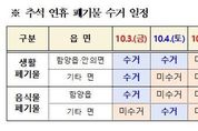 미담타임스 김준완 기자 | 함양군은 민족 최대 명절 추석을 맞아 고향을 찾는 귀성객과 군민들이 쾌적한 환경에서 명절을 보낼 수 있도록 추석 연휴 동안 ‘생활 쓰레기 관리 대책반’을 운영한다. 군은 추석 연휴가 시작되는 10월 3일부터 9일까지 생활폐기물과 음식물 쓰레기 적체를 예방하기 위해 대책반을 편성, 연휴 기간 발생하는 쓰레기 민원과 불법투기 신고에 신속히 대응할 계획이다. 생활 쓰레기 수거 일정은 ▲3일 전 읍면 ▲4일 함양읍·안의면 ▲7일 전 읍면 ▲8일 함양읍·안의면 외 기타 면 ▲9일 전 읍면에서 정상 수거한다. 음식물 쓰레기 수거는 ▲3일 함양읍 ▲4일 함양읍 외 기타 면 ▲7일 전 읍면 ▲8일 전 읍면 ▲9일 함양읍 외 기타 면에서 정상적으로 진행된다. 다만 추석 당일인 6일에는 쓰레기 민원 발생 시 즉시 차량과 인력을 투입할 수 있도록 비상 수거반을 운영해 쾌적한 명절 분위기 조성에 최선을 다할 방침이다. 군 관계자는 “추석 연휴 동안 군민과 귀성객 모두가 쾌적한 환경에서 명절을 보낼 수 있도록 철저히 준비하고 있다”라며 “연휴 기간 발생하는 폐기물은 반드시 정해진 수