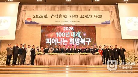 미담타임스 김준완 기자 | 울산 북구는 9일 오후 2시 JW컨벤션센터에서 구정발전 기원 신년인사회를 열었다. 이날 행사에는 전·현직 국회의원 및 시·구의원을 비롯한 지역 기업체 대표, 단체장, 사회복지기관 시설장 등이 참석해 북구 발전을 한뜻으로 기원했다. 행사는 구정 홍보영상 상영과 내빈소개, 박천동 북구청장과 김두겸 울산시장, 김상태 북구의회 의장, 윤종오 국회의원의 신년 인사로 이어졌다. 이날 북구는 2026년 구정 슬로건도 발표했다. 2026년 북구 슬로건은 '100년 대계, 피어나는 희망북구'로, 민선8기가 그려온 100년의 미래 전략을 현실 속에서 하나씩 결실로 맺어 가겠다는 선언의 의미를 담았다. 박천동 북구청장은 이날 신년인사에서 올해 구정 운영 방향을 설명하며 "지난해 북울산역 KTX-이음 정차 확정으로 우리 구가 광역 교통망의 중심으로 도약할 수 있는 중대한 전환점을 맞게 된 것은 매우 의미 있는 성과"라며 "올 한해도 주민과 함께 북구의 밝은 내일을 위해 멈추지 않고 나아 가겠다"고 말했다.