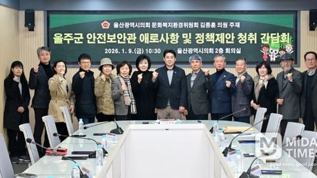 미담타임스 김준완 기자 | 울산시의회 문화복지환경위원회 김종훈 의원은 9일 오전 10시 30분 시의회 2층 회의실에서 ‘울주군 안전보안관 애로사항 및 정책제안 청취 간담회’를 개최했다. 간담회는 안전보안관 활동 현황을 공유하고 생활 속 안전 위험요소와 개선․건의사항을 공유하기 위해 마련했으며, 울주군 안전보안관 이재우 대표, 울산시 시민안전실 관계자 등 10여명이 참석했다. 참석자들은 지역 곳곳에서 발굴한 생활 속 안전 위험요소 뿐만 아니라 안전보안관 운영과 관련된 개선 사안을 적극적으로 건의했다. 특히 안전보안관에 대한 실질적 지원 확대와 전문성 향상을 위한 체계적인 교육 프로그램이 필요하다는 데 공감했으며 △지역축제 등 대규모 행사시 안전보안관 참여 및 연계 △사기 진작 및 자긍심 고취 방안 △어린이 안전보안관과의 협업 및 청소년 안전보안관 도입 등을 건의했다. 김종훈 의원은 직접 아웃도어 기록앱 등을 이용해 보도블록 파손 및 도로시설물 파손, 가로수 뿌리 돌출, 규제봉 훼손 등 생활 밀착형 위험 요소를 직접 발굴․개선한 사례를 소개하고, 활용 방안을 제안하기도 했다. 김 의원은 “