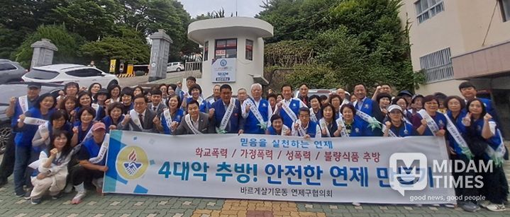미담타임스 김교환 기자 | 연제구는 6월 9일 부산경상대학교 일원에서 바르게살기운동 연제구협의회(회장 김용갑) 주관으로 회원 등 50여 명이 참여한 가운데 4대악 추방 캠페인 및 환경정비를 실시했다.
