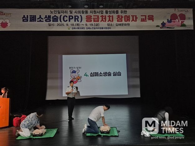미담타임스 김교환 기자 | (재)김해시복지재단(대표이사 임주택)에서 운영 중인 김해시니어클럽(김해노인일자리창출지원센터)은 지난 18일부터 19일까지 양일에 걸쳐 노인역량활용사업 4개 사업단 참여자 400명을 대상으로 ‘심폐소생술(CPR) 응급처치 교육’을 성황리에 실시했다.