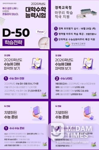 미담타임스 김준완 기자 | 경북교육청은 2026학년도 대학수학능력시험을 50여일 앞두고 수험생들에게 마무리 학습에 도움을 주고자 ‘완벽 수능 마무리 패기키’를 지원한다고 24일 밝혔다.