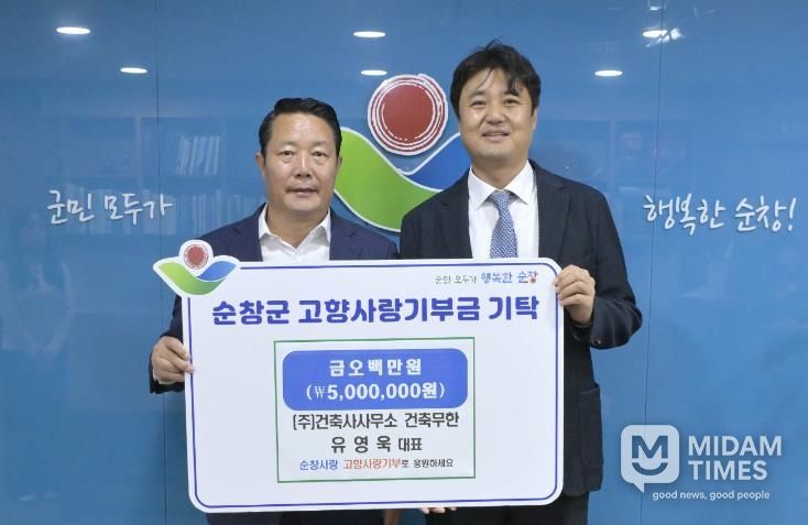 미담타임스 정인화 기자 | (주)건축사사무소 건축무한 유영욱 대표가 지난해에 이어 올해도 순창군에 고향사랑기부금 500만원을 기탁하며 순창군을 응원하는 마음을 전했다.
