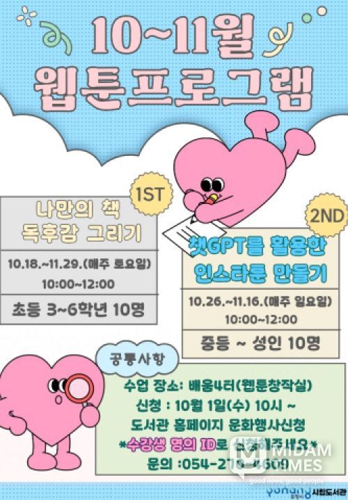 미담타임스 김준완 기자 | 포항시립포은중앙도서관은 ‘2025년 웹툰·미디어 라이브러리 프로그램’의 수강생을 1일 오전 10시부터 선착순 모집한다.