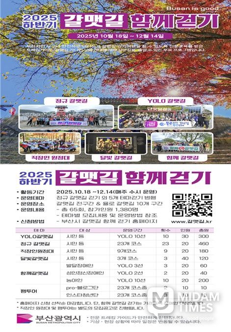 미담타임스 김교환 기자 | 부산시는 오는 10월 18일부터 12월 14일까지 두 달여 간 '2025년 하반기 욜로(YOLO) 갈맷길 함께 걷기 행사'를 운영한다고 밝혔다.