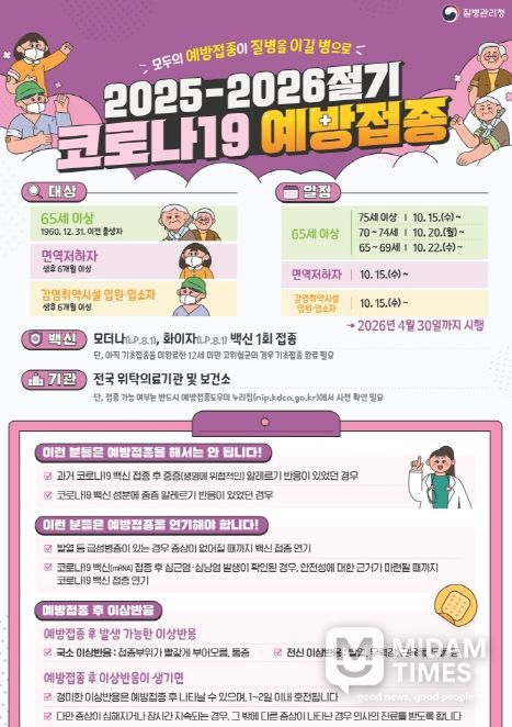 한편, 이번 접종에는 최신 변이주에 대응하는 LP.8.1. 화이자·모더나 백신이 사용되며, 주소지와 관계없이 코로나19 예방접종 위탁의료기관에서 무료로 받을 수 있다.
