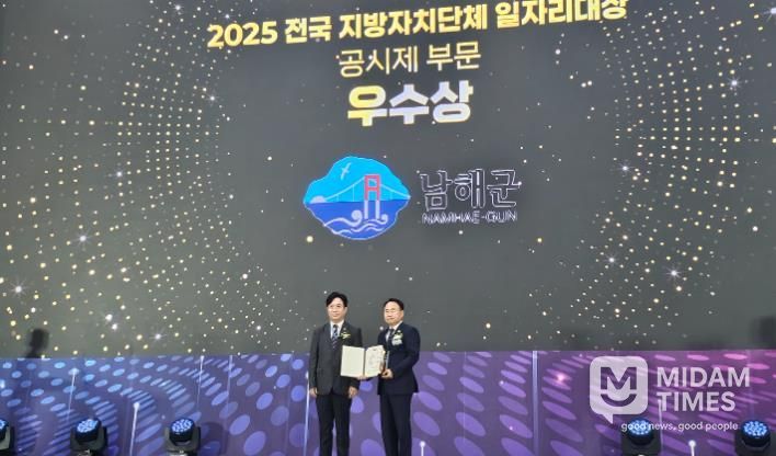 미담타임스 김교환 기자 | 남해군이 9월 30일 청주 오스코에서 열린 고용노동부 주관 ‘2025년 전국 지방자치단체 일자리 대상’ 시상식에서 공시제 분야 우수상을 수상했다. 이번 수상은 2016년 우수상 이후 9년 만에 거둔 성과다.