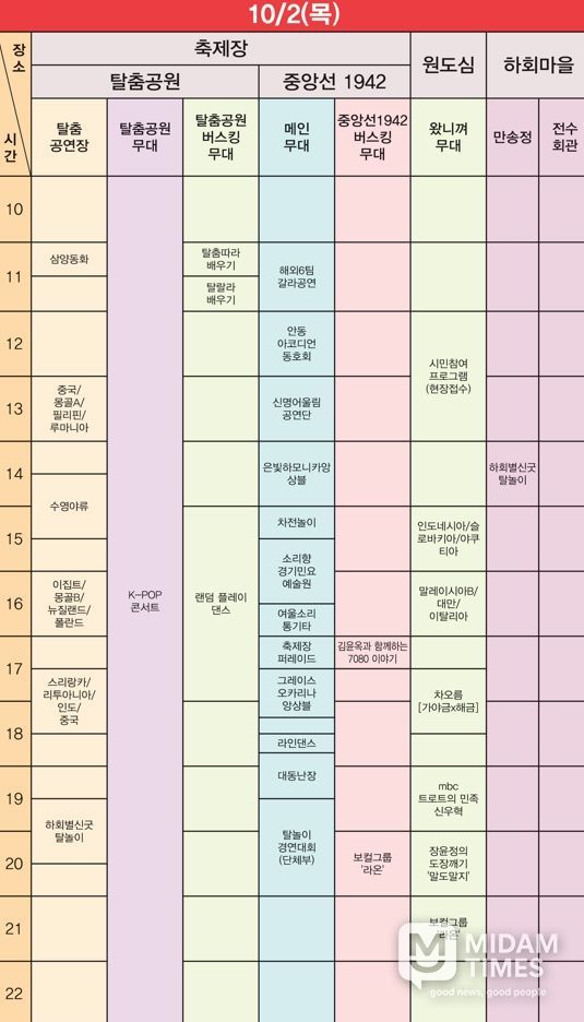 안동시는 “일곱째 날은 전통 탈춤, 해외공연, 그리고 K-POP 무대가 함께 어우러져 남녀노소 누구나 즐길 수 있는 다채로운 날”이라며, “특히 한류관광페스타는 국내외 관광객을 아우르는 대표 프로그램이 될 것”이라고 밝혔다.