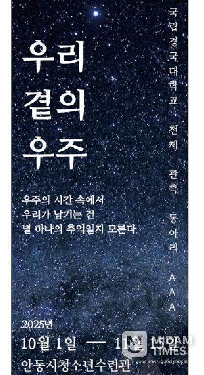 미담타임스 김준완 기자 | 안동시시설관리공단이 운영하는 안동시청소년수련관은 10월 1일부터 11월 15일까지 청소년수련관 1층 꿈꾸는 미술관에서 '우리 곁의 우주展'을 개최한다고 밝혔다.