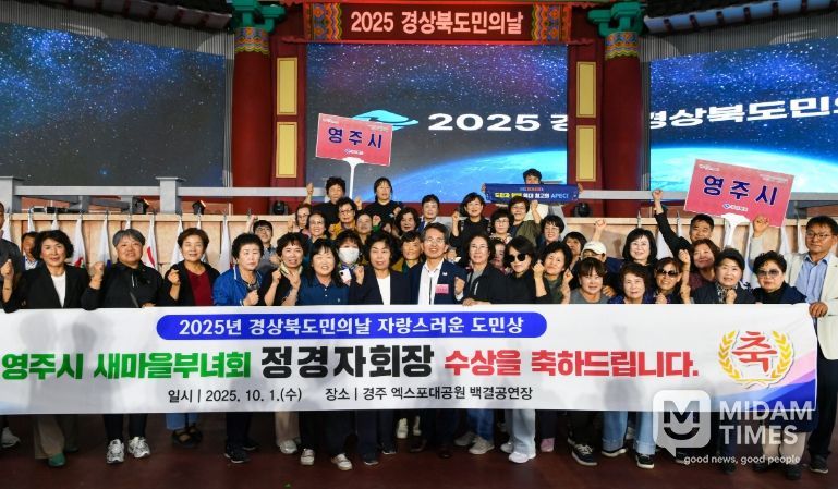 미담타임스 김준완 기자 | 영주시는 10월 1일 경주 엑스포대공원 백결공연장에서 열린 ‘2025년 도민의 날 기념식’에서 정경자 영주시 새마을부녀회장이 ‘영주시 자랑스러운 도민상’을 수상했다고 밝혔다.
