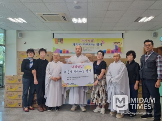 미담타임스 김교환 기자 | 법보종찰 해인사와 조계종 사회복지재단 산하 코끼리행복복지센터는 10월 1일 봉산면, 묘산면, 가야면, 야로면의 노인맞춤돌봄서비스 대상자 어르신 800가구에 송편과 과일을 담은 선물 상자를 전달하는 ‘추석맞이 행복나눔 행사’를 진행했다.