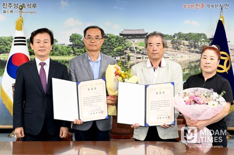미담타임스 김교환 기자 | 진주시는 2일 6·25전쟁 참전 유공자인 ‘故 김판식 일병’과 ‘故 윤도기 일병’의 유가족인 고인들의 조카 김형원, 윤성수 씨에게 각각 화랑무공훈장을 전수했다.