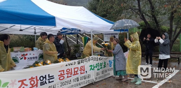 미담타임스 김교환 기자 | 함양군은 추석 연휴 첫날인 3일 공설추모공원에서 성묘객을 대상으로 ‘플라스틱 조화 근절 행사’를 열고 친환경 추모 문화 확산에 나섰다고 밝혔다.