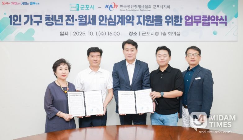 미담타임스 정주환 기자 | 군포시는 10월 1일 시청 1층 회의실에서 한국공인중개사협회 군포시지회와 청년 1인 가구 전월세 안심계약 지원을 위한 업무협약을 체결했다.