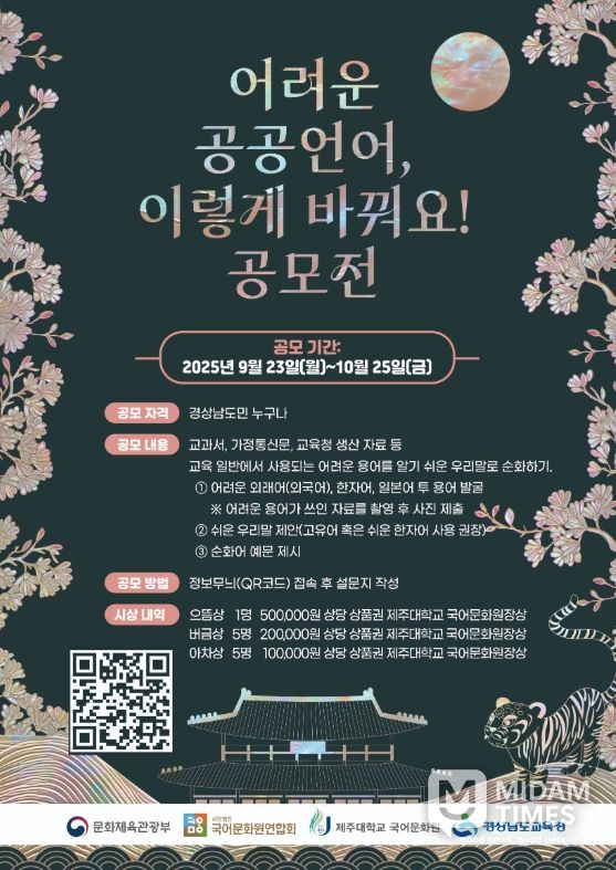 미담타임스 박민정 기자 | 경상남도교육청과 제주대학교 국어문화원(원장 배영환)이 교육 현장에서 사용되는 어려운 공공언어를 쉽고 바른 우리말로 바꾸기 위한 ‘어려운 공공언어, 이렇게 바꿔요!’ 공모전을 오는 25일까지 개최한다.