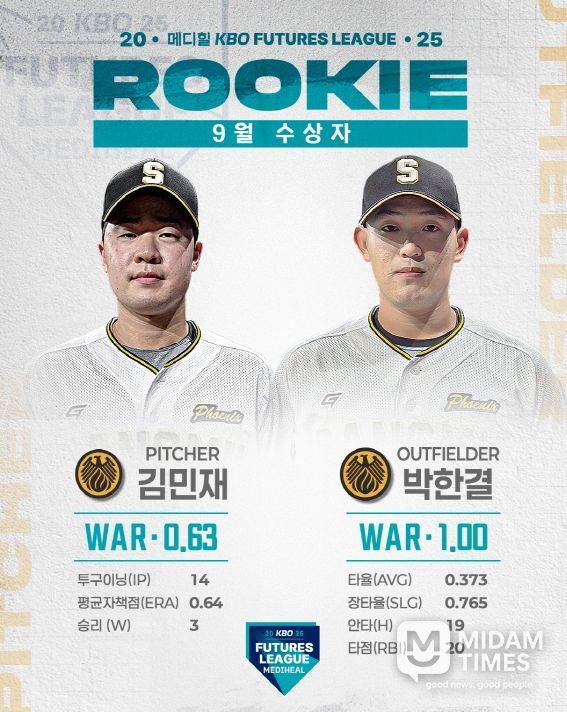 미담타임스 박민정 기자 | 2025 메디힐 KBO 퓨처스리그의 9월 퓨처스 루키상 수상자로 투수 부문에는 상무 김민재가 WAR 0.63, 타자 부문에는 상무 박한결이 WAR 1.00을 기록하며 각각 선정됐다.