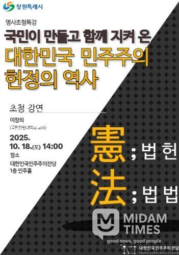 미담타임스 김교환 기자 | 창원특례시는 오는 10월 18일 오후 2시, 대한민국민주주의전당 민주홀에서 ‘대한민국 민주주의 헌정의 역사’ 특별 강연을 개최한다고 밝혔다.