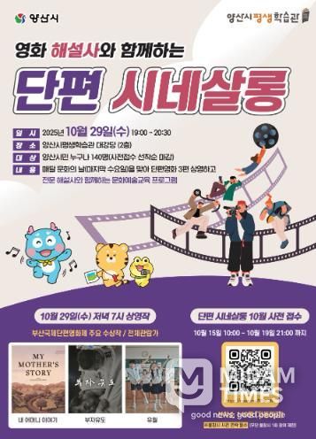 미담타임스 김교환 기자 | 양산시평생학습관은 매월 마지막 수요일 ‘문화가 있는 날’을 맞아 단편영화 상영과 전문 해설이 함께하는 문화예술교육 프로그램'단편 시네살롱'을 운영한다고 밝혔다.