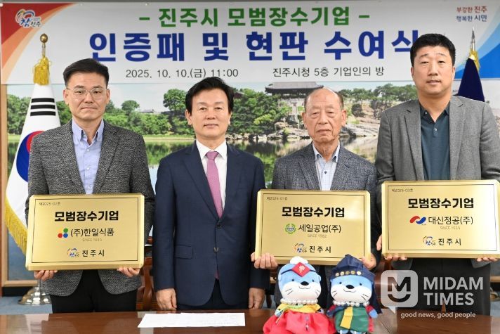 미담타임스 김교환 기자 | 진주시는 10일 시청 기업인의 방에서 올해 모범장수기업으로 선정된 세일공업(주), ㈜한일식품, 대신정공(주)에 인증패와 현판을 수여했다.