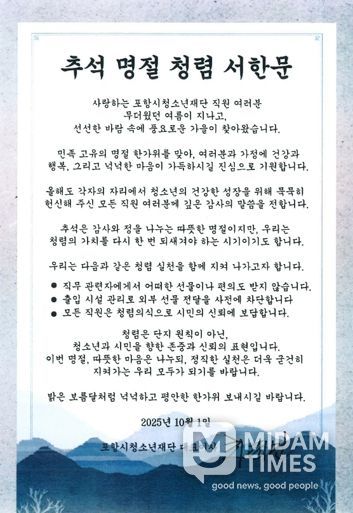 최제민 포항시청소년재단 대표이사는 서한문에서 “청렴은 단지 규범이 아니라 청소년과 시민에 대한 신뢰의 약속이자 존중의 표현”이라며, “이번 명절이 공직자의 청렴 의식을 되새기고, 투명한 행정을 실천하는 계기가 되길 바란다”고 전했다.
