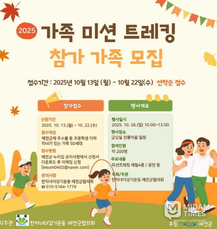 미담타임스 김준완 기자 | 예천군과 한자녀더갖기운동 예천군협의회는 22일까지 ‘가족 미션 트레킹’ 참가 가족을 선착순 모집한다.