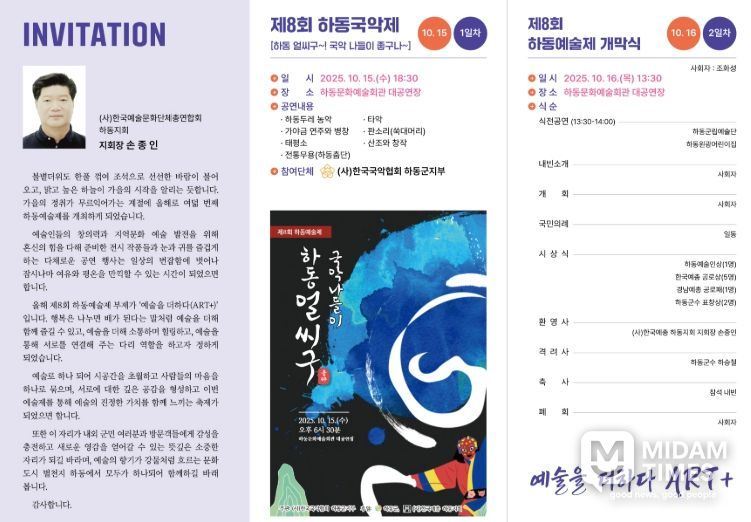 미담타임스 김교환 기자 | ‘제8회 하동예술제’가 10월 15일~17일 3일간 하동문화예술회관 일원에서 개최된다.