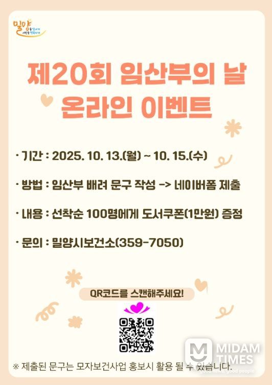 미담타임스 김교환 기자 | 경남 밀양시는 제20회 임산부의 날을 맞아 13일부터 15일까지 3일간 온라인 이벤트를 진행한다고 밝혔다.