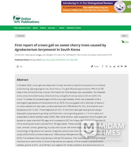 미담타임스 김준완 기자 | 산청군의 체리 혹병 규명 사례가 국내에서는 처음으로 국제 학술지에 게재됐다.