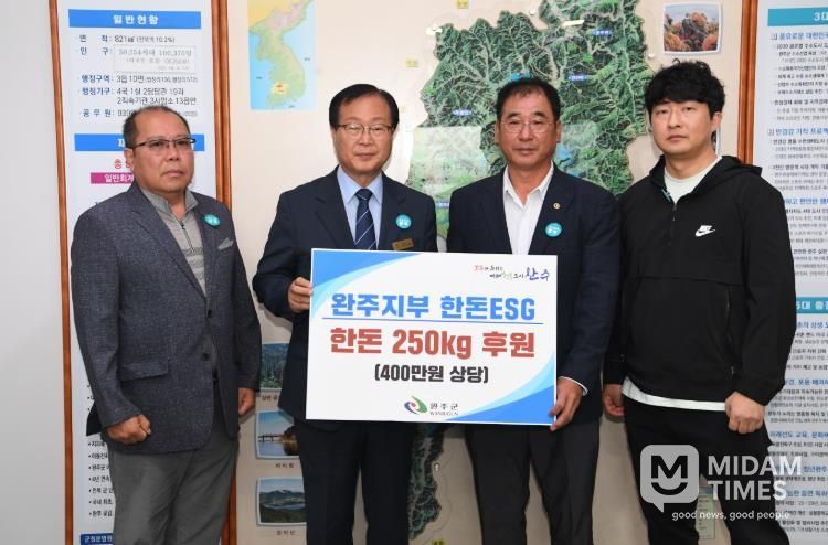 미담타임스 정인화 기자 | (사)대한한돈협회 완주지부가 완주군에 400만 원 상당의 돼지고기 전지 250kg를 전달했다.
