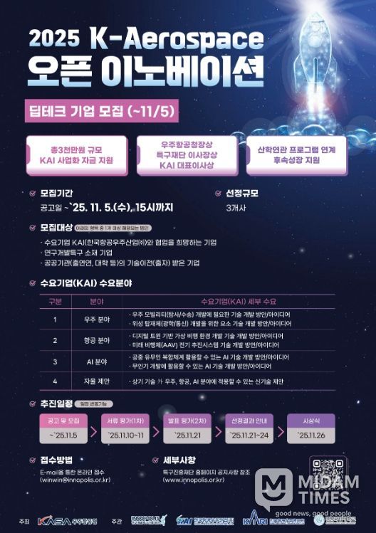 모집 대상은 수요기업인 KAI에서 제시한 4개 분야(우주·항공·AI, 자유)에서 KAI와 협업을 희망하는 기업으로, 서류 및 발표평가를 거쳐 최종 3개사를 선정할 예정이다.