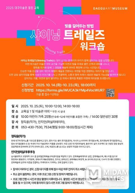미담타임스 김교환 기자 | 대구문화예술진흥원 대구미술관은 오는 10월 25일, 오전 10시, 오후 2시, 총 2회에 걸쳐 열린 교육 ‘샤이닝 트레일즈 워크숍: 빛을 걸어 두는 방법’을 운영한다.