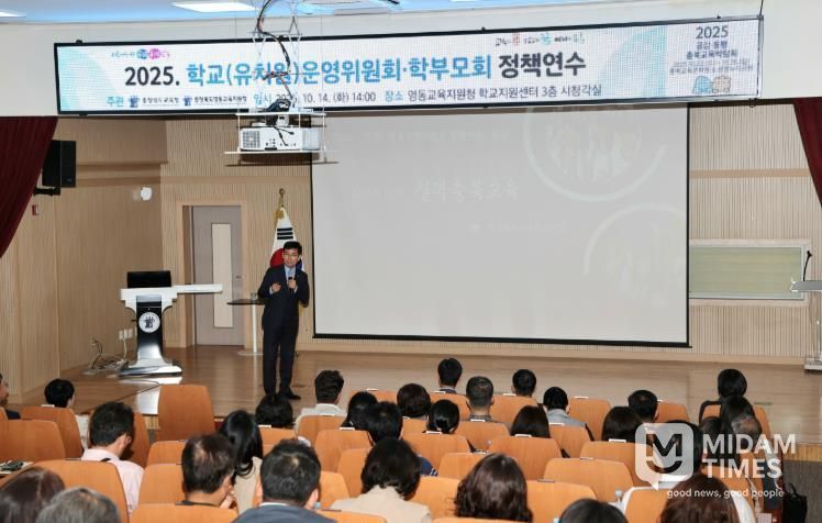 미담타임스 박민정 기자 | 충청북도영동교육지원청은 14일 영동교육지원청 학교지원센터 3층 시청각실에서 관내 유·초·중·고등학교 운영위원, 학부모회 임원, 학교(원)장, 행정실장 120여 명을 대상으로 2025. 학교(유치원)운영위원회·학부모회 정책연수를 실시했다.