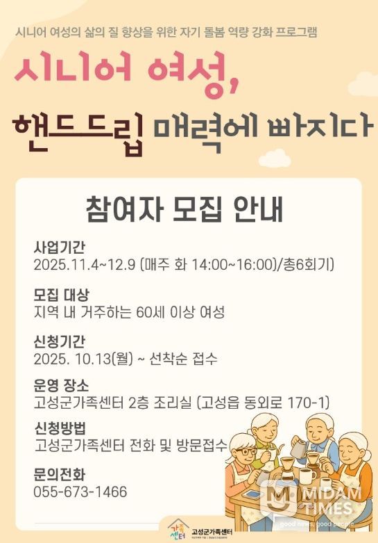 미담타임스 김교환 기자 | 고성군가족센터(센터장 황순옥)는 지역 내 60세 이상 시니어 여성의 자기 돌봄 역량 강화 프로그램 『시니어 여성, 핸드드립 매력에 빠지다』의 참여자를 모집한다.