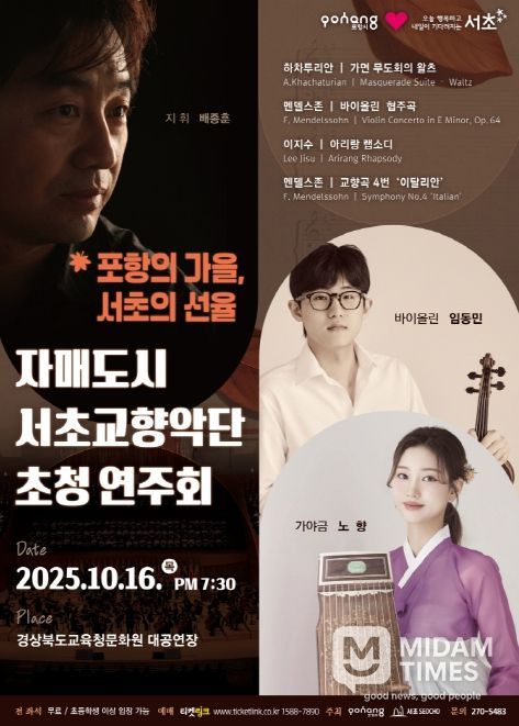 미담타임스 김준완 기자 | 포항시는 오는 16일 경상북도교육청문화원 대공연장에서 자매도시인 서초교향악단을 초청해 ‘포항의 가을, 서초의 선율’ 교향악 공연을 연다고 밝혔다.