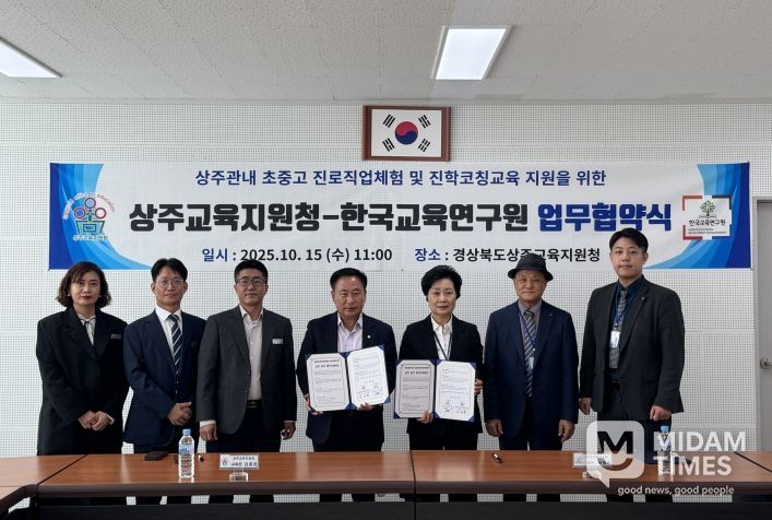 미담타임스 김준완 기자 | 경상북도상주교육지원청은 10. 15. 11:00, 교육지원청 2층 소회의실에서 『2025학년도 행복교육 실현을 위한 업무협약(MOU) 체결식』을 주관하고, 한국교육연구원과 함께 지역 학생들의 미래 역량 강화를 위한 공동 협력에 나섰다.