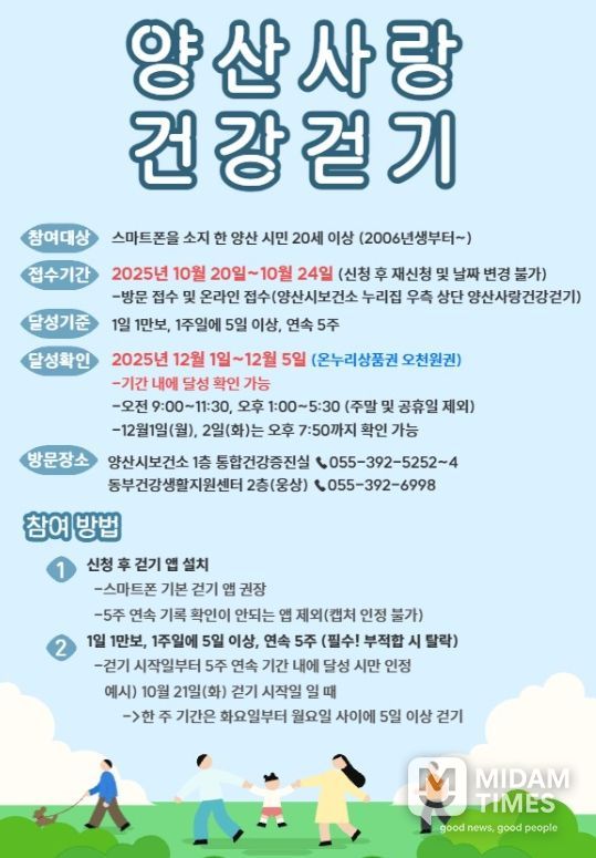 미담타임스 김교환 기자 | 양산시는 일상에서 스스로 실천할 수 있는‘양산사랑 건강걷기’사업의 4차 접수를 오는 10월 20일부터 시작한다고 밝혔다.
